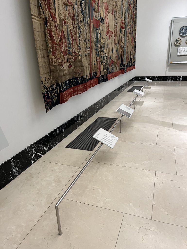 Pictured above, and in main article image: Bespoke rigid rail barrier & signage system designed and manufactured for the V&A, London.