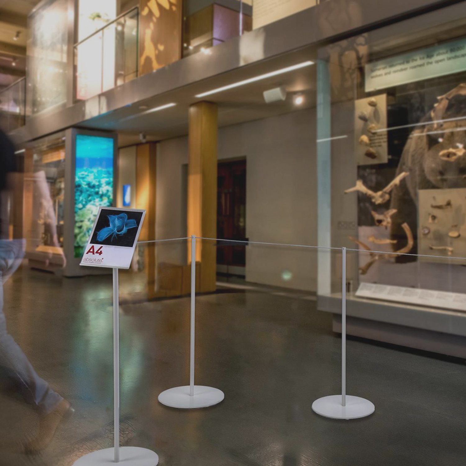 If an exhibition invites visitors to attend to sound, material, and atmosphere, the tools used to manage movement should feel consistent with that ambition. The same principle applies to signage. Information Stands, Signage Plates and discreet label solutions help reinforce the route, explain temporary changes and answer practical questions before staff intervention is needed. Done effectively, they reduce hesitation and make the entire experience feel calmer.