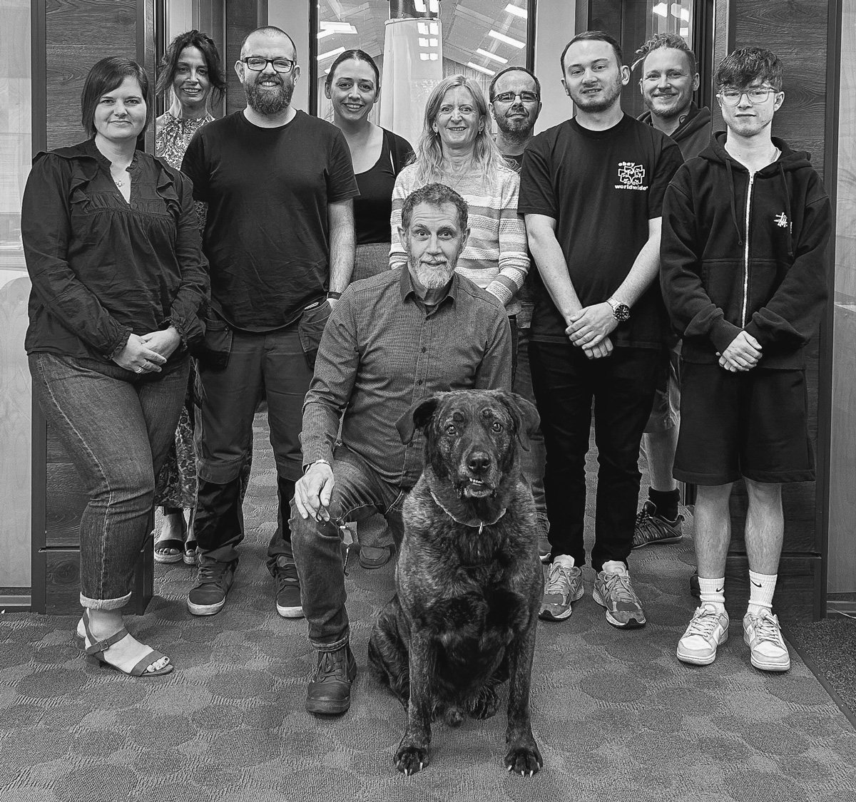Above: A group photo of some of the Absolute team, taken at Absolute offices, with Sam Sprague positioned lower centre, with dog and office chief of morale, Rhino.